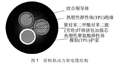 为了保证盾构机动力软电缆的柔软性,导体选用5类绞合铜导体,并对结构进行优化设计缆芯中间采用芳纶纤维挤包中心加强芯,以增强电缆的抗拉性和弯曲性能,使电缆在承受纵向拉力及填充缓冲作用时绝缘部分不受损伤。